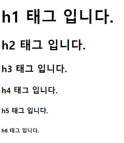 h1 태그의 크기가 가장 크게 h6 태그의 크기가 가장 작게 표현됩니다.