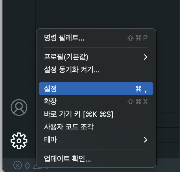 1. 하단 톱니바퀴 아이콘 클릭 -> 설정 클릭 또는 단축키 (컨트롤 + , ) 맥은 (커멘트 + ,)