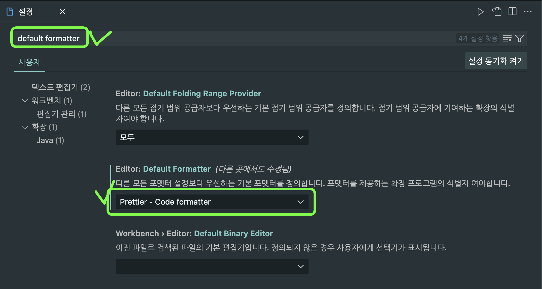 2. 설정 검색에 "default formatter" 검색 후 하단에 "Editor: Default formatter을 Prettier로 변경"