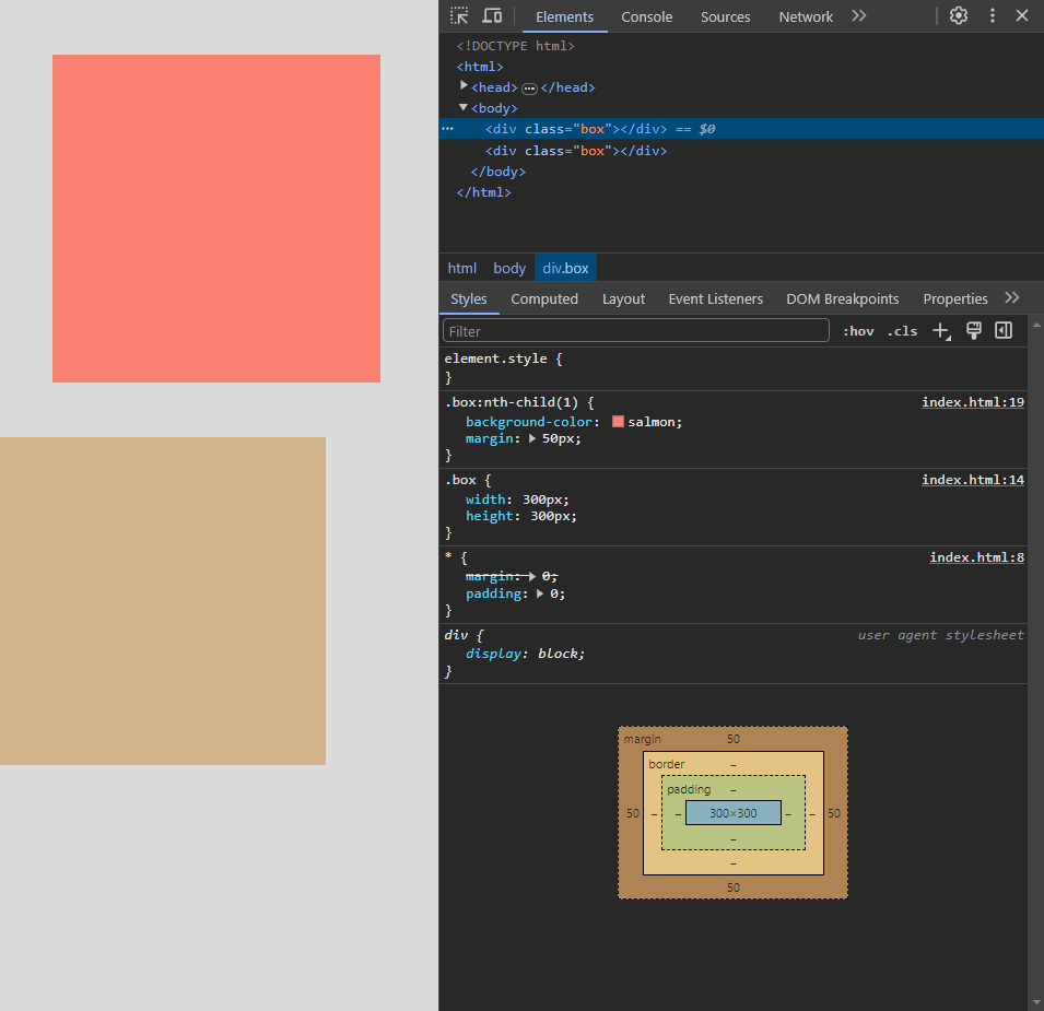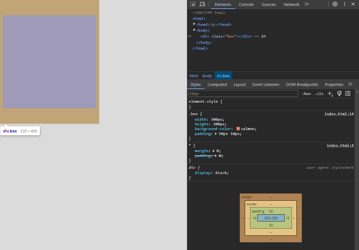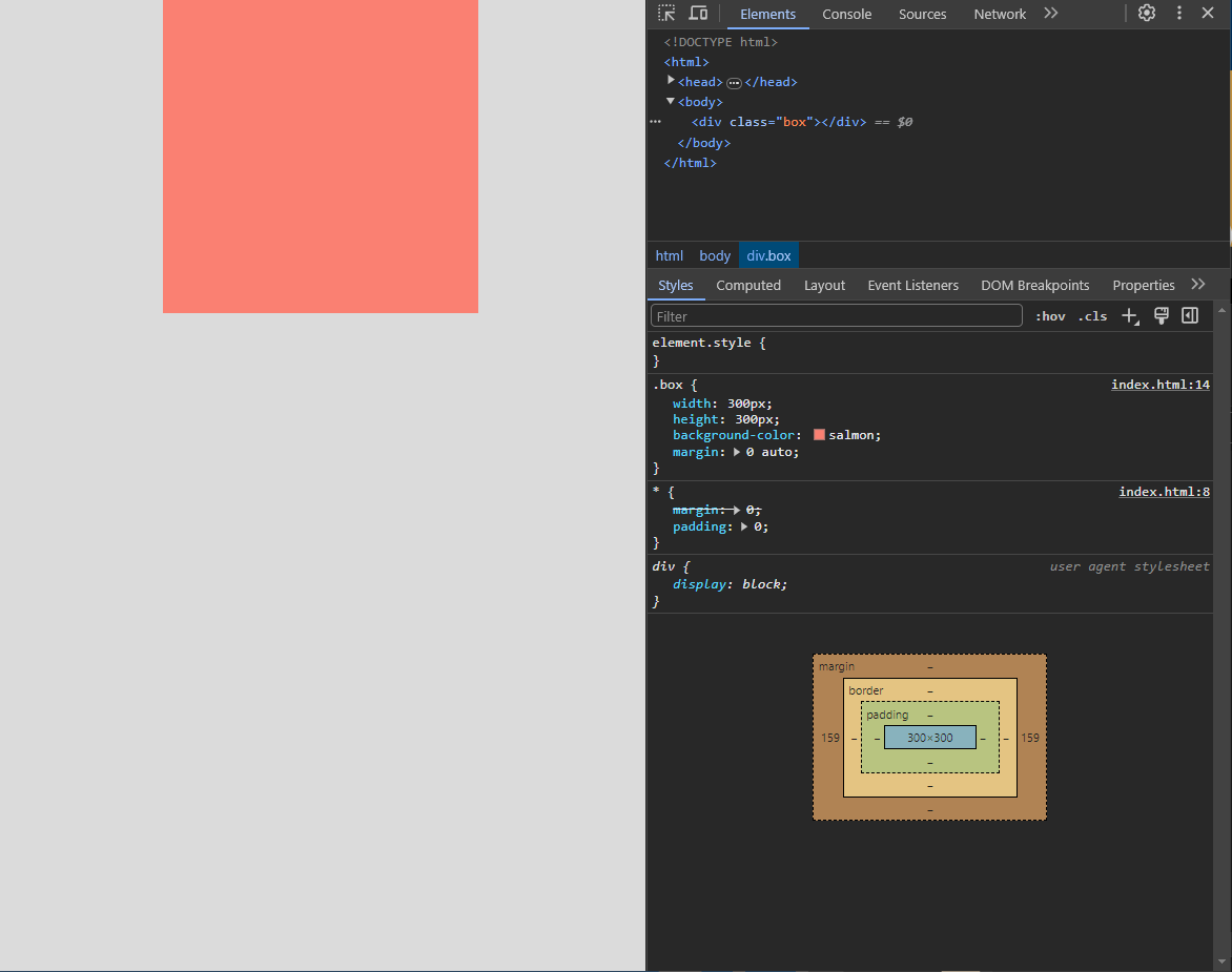 추가 결과, 박스의 크기는 브라우저에 300x300으로 표현되는 것을 확인할 수 있습니다.
