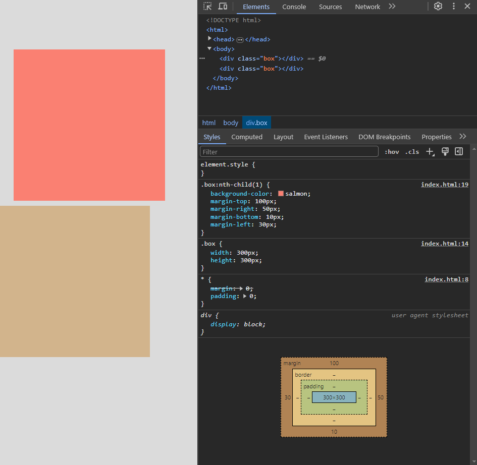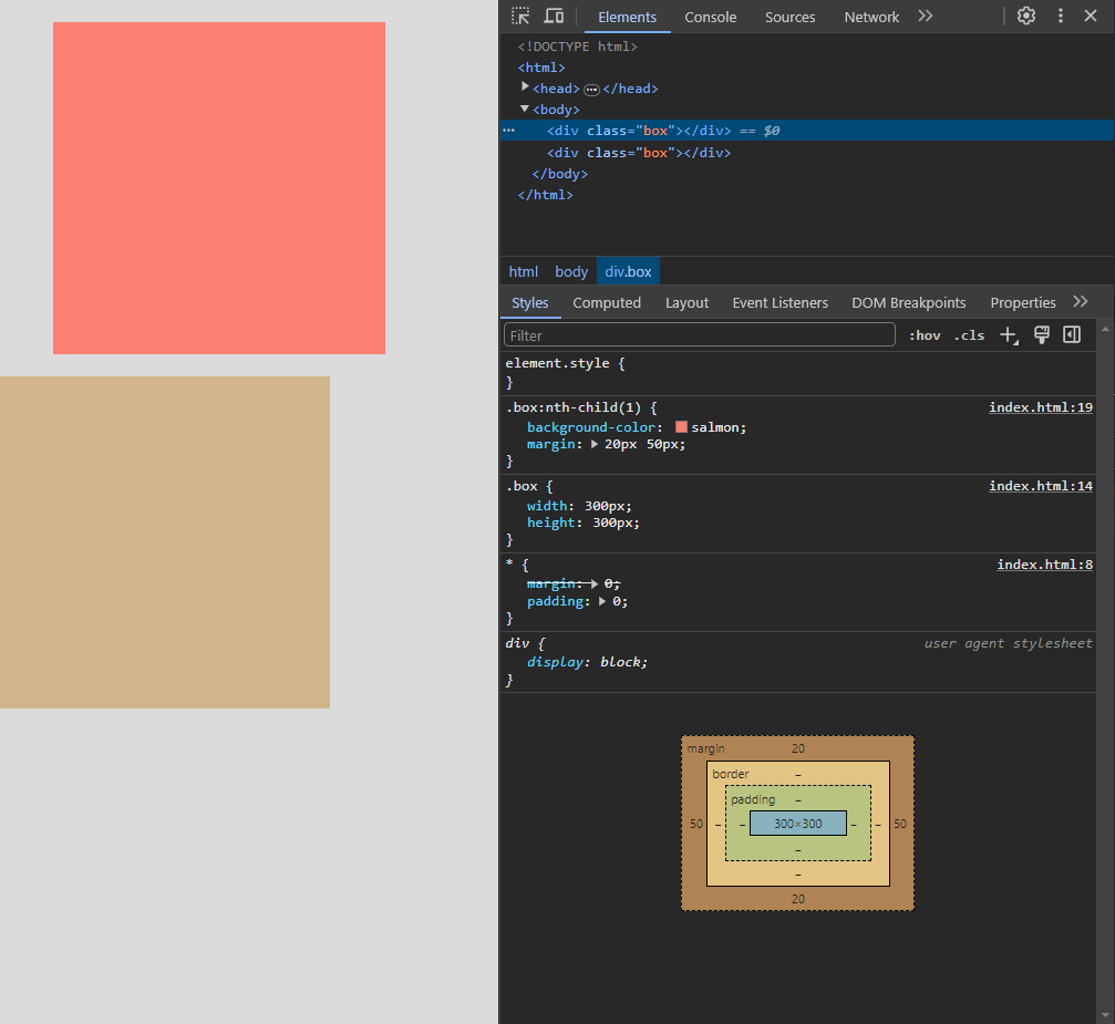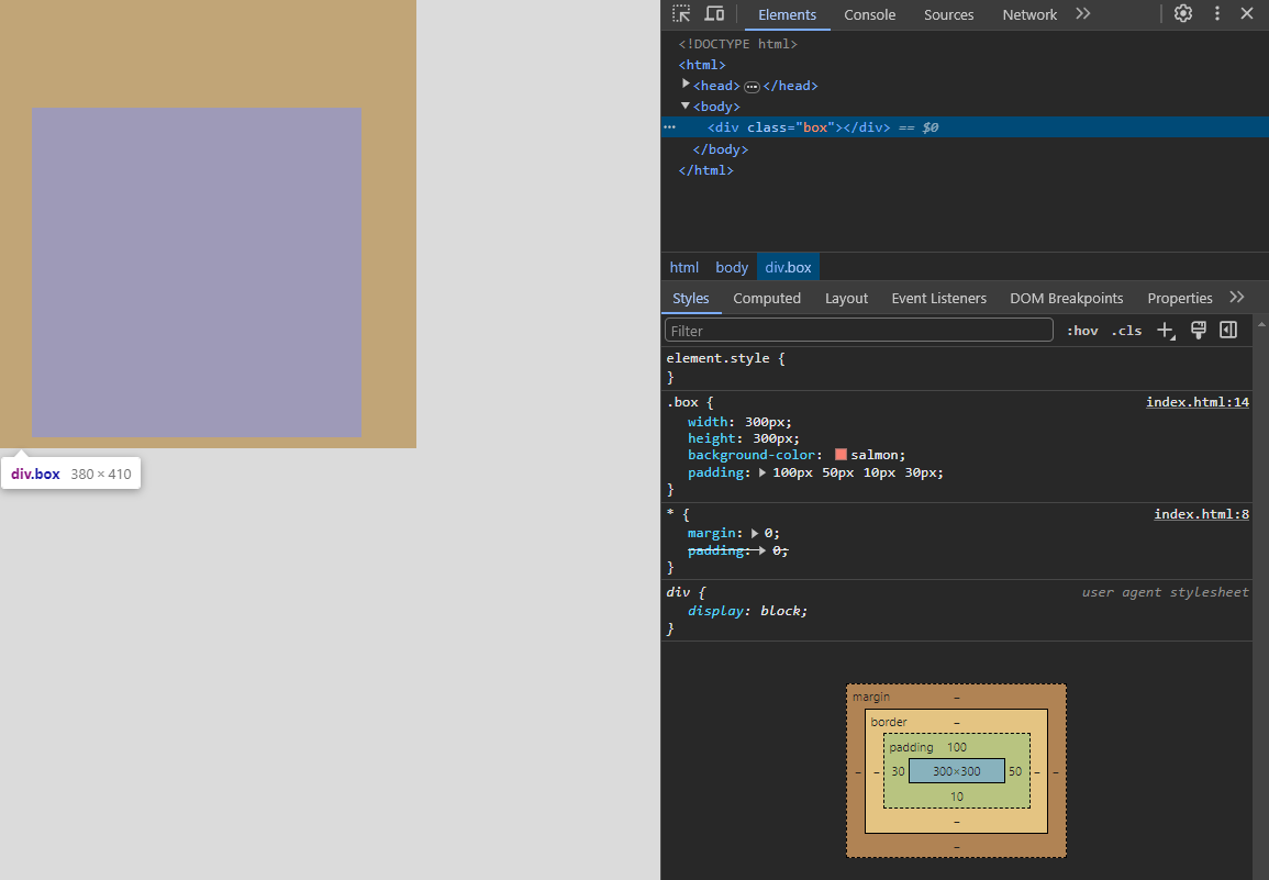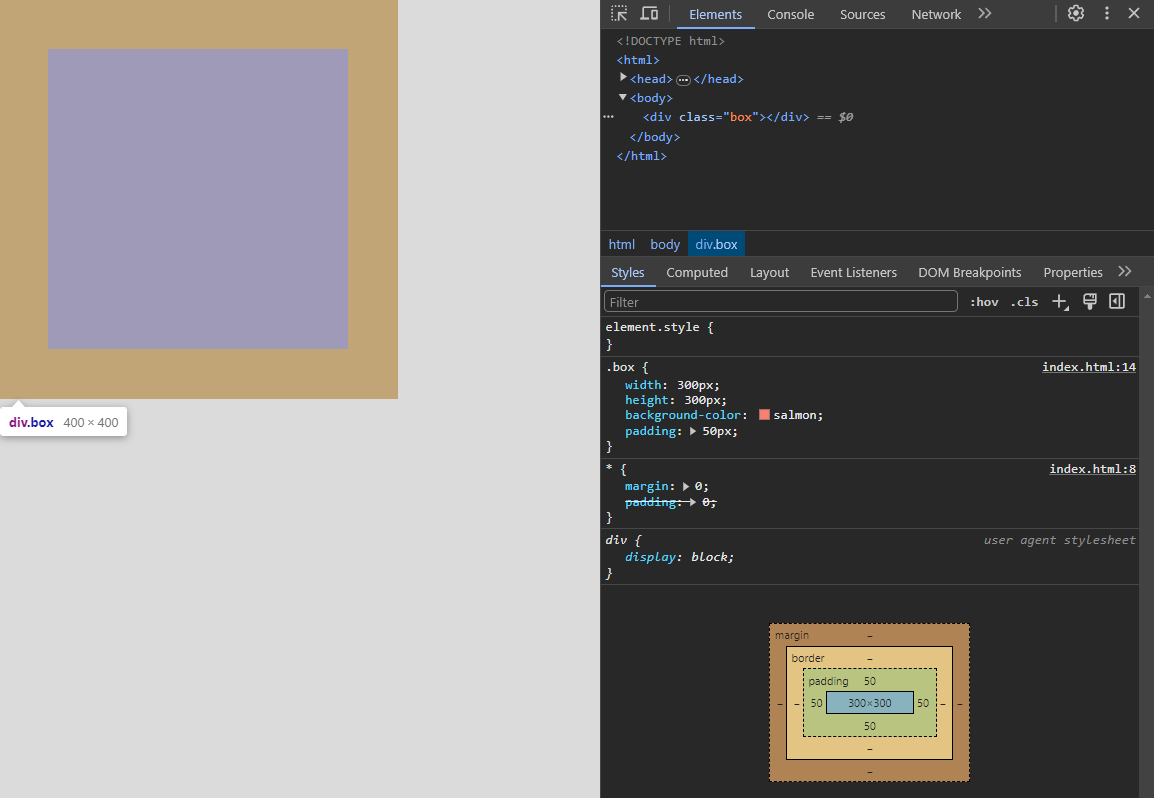 추가 결과, 박스의 크기는 브라우저에 300x300으로 표현되는 것을 확인할 수 있습니다.
