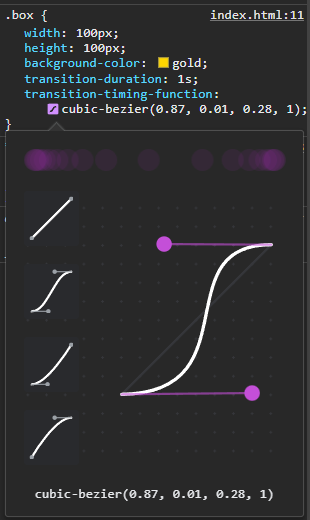 적용된 transition-timing-function의 보라색 아이콘을 클릭하여 나오는 가속도 그래프의 보라색 동그라미를 드래그하여 원하는 형태의 가속도를 만들어 줄 수 있습니다.