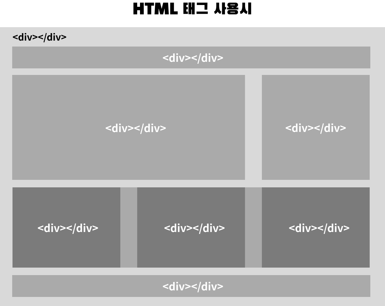 보통 기본 레이어를 구성하기 위해 div 태그를 사용하여 class 또는 id 속성을 사용하여