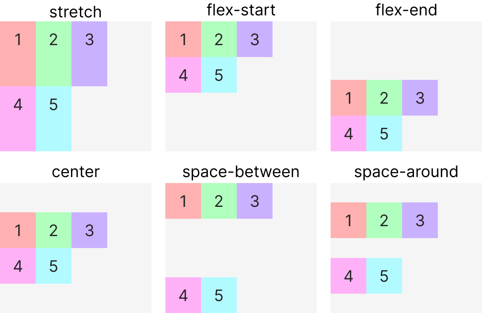flex-wrap: wrap이 설정된 상태에서 자식요소의 행이 2줄 이상 되었을 때 교차축(main-axis)의 정렬 방법을 설정하는 속성입니다.