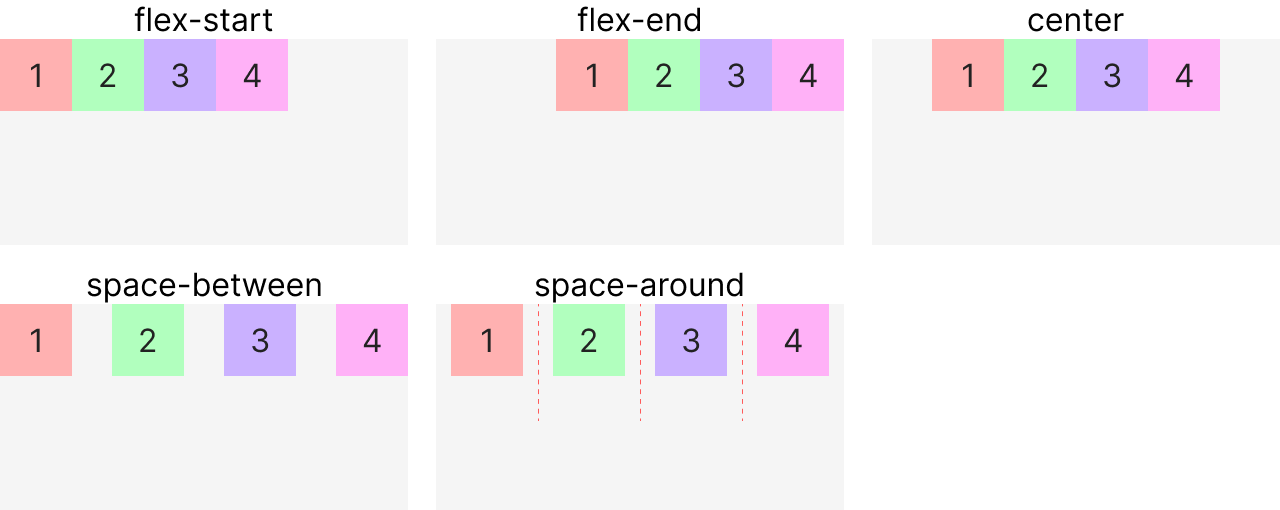 | space-around | 자식요소의 둘레(around)에 동일한 간격을 만들어줌 |