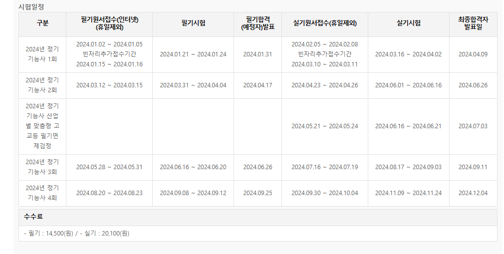 아래의 이미지는 2024년도 기능사 시험 일정표입니다.